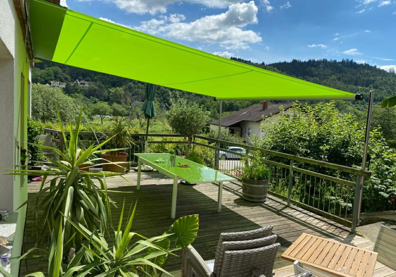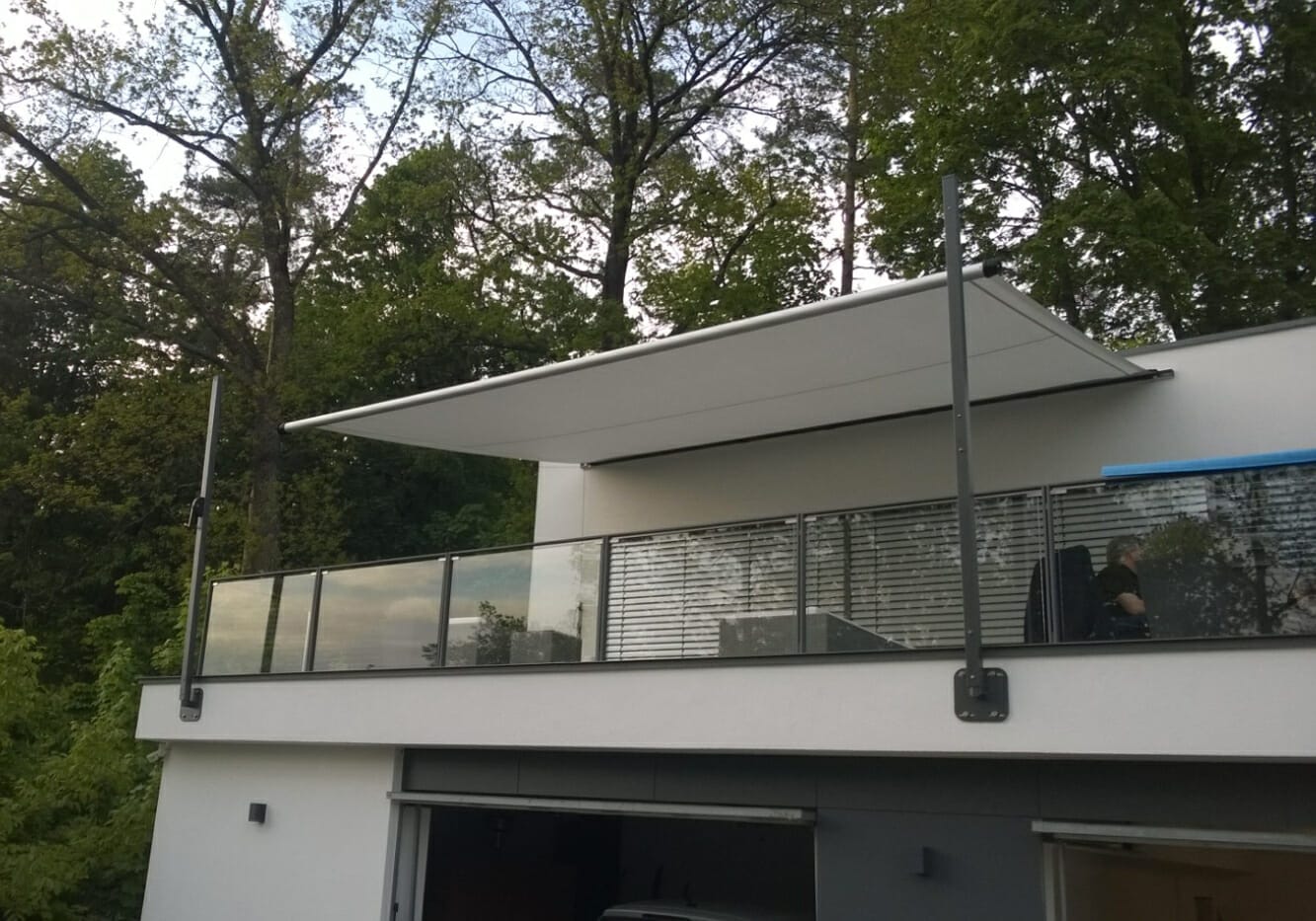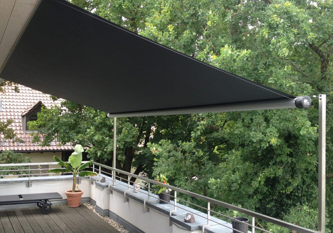 Deze reeks kan u aan een wand bevestigen en uitrollen naar twee RVS-spanzuilen. De hoogte van de zuilen kiest u geheel zelf, net als de uitvoering (bv. rond of vierkant). De palen kan u aan een of beide zijden in de hoogte verstellen. Ook dit zonweringsysteem heeft een minimale trekkracht en hefboomwerking aan de gevel, zodat het op elk type gevel past.