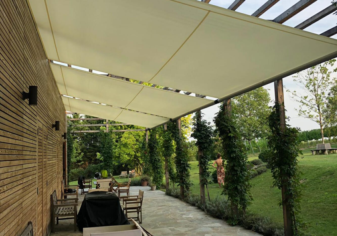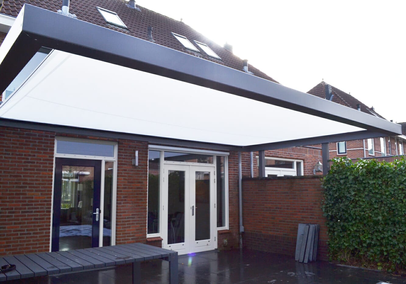Bij de Shade Structure monteert Iwan een of meerdere zeil overkappingen als wandhouder aan een bestaande constructie. Het type zonnetent leent zich uitstekend voor allerlei toepassingen, waaronder zeiloverkappingen van wand tot wand plaatsen.